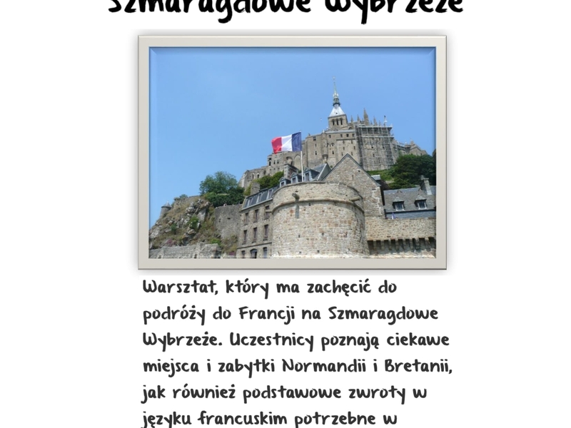 Warsztat, który ma zachęcić do podróży do Francji na Szmaragdowe Wybrzeże. Uczestnicy poznają ciekawe miejsca i zabytki Normandii i Bretanii, jak również podstawowe zwroty w języku francuskim potrzebne w podróży (hotel, restauracja, sklep etc.) Przewidziany konkurs z nagrodami.