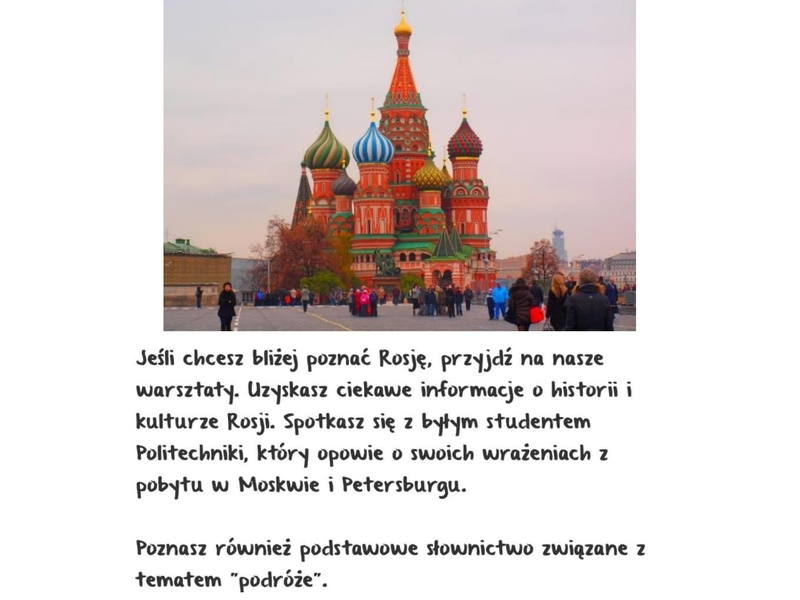 Jeśli chcesz bliżej poznać Rosję, przyjdź na nasze warsztaty. Uzyskasz ciekawe informacje o historii i kulturze Rosji. Spotkasz się z byłym studentem Politechniki, który opowie o swoich wrażeniach z pobytu w Moskwie i Petersburgu.